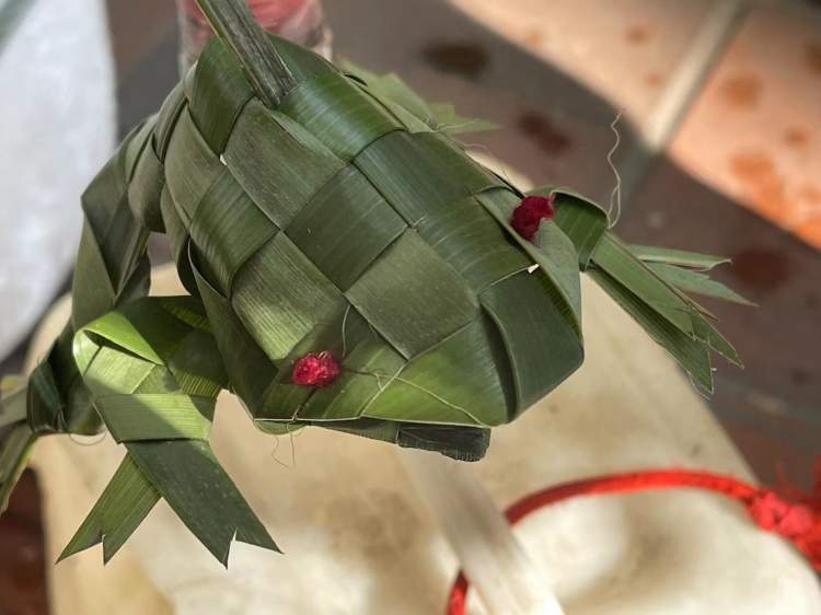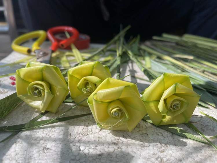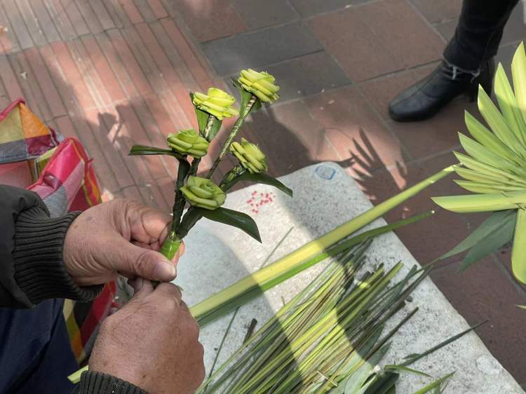 说话间,杨师傅向小编露了一手。“用棕榈叶编花朵,由于花朵要有层次感,在编织过程中要不停地加减棕叶,编到最后还要记得将花朵和花茎的连接处扎牢。”顷刻间,一朵盛开的花朵编织出来了。
