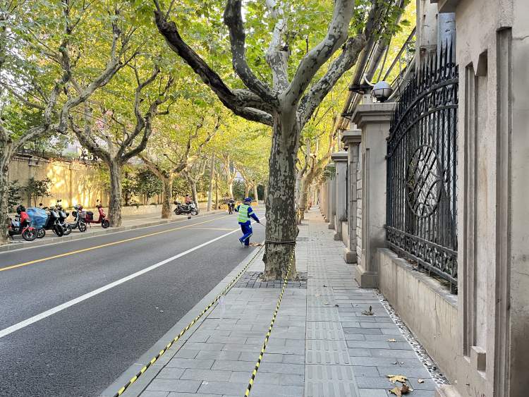 思南路两旁的行道树,以高大繁茂的悬铃木为主。每到落叶季节,道路就开始拥有不一样的意境。目前,树叶还呈绿色,从12月1号起到12月15日,从建国中路到复兴中路段,将能欣赏到落叶层叠的美景。