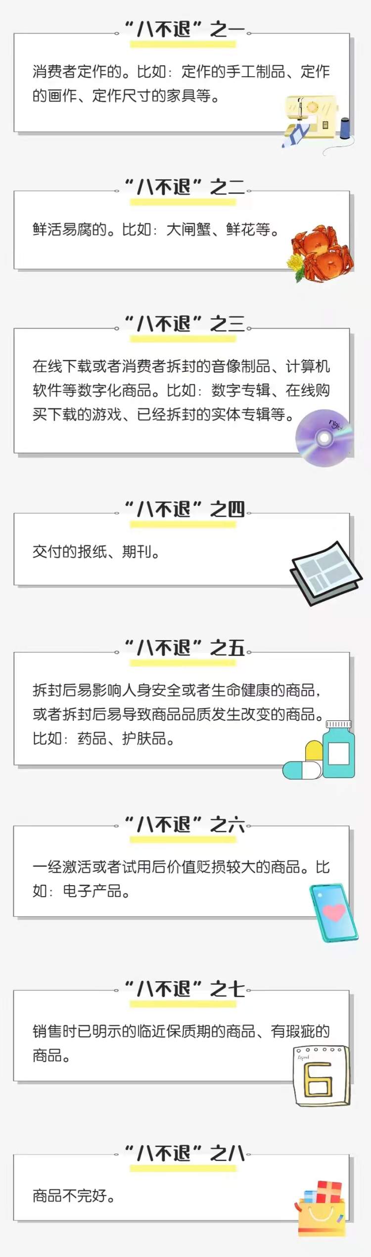在我国出台的专门针对网购退换货的《网络购物商品七日无理由退货暂行办法》中,明确规定了不适用七日无理由退货的商品进行明确规定,即著名的“八不退”,及其他“视为货品完好、不完好”的标准。具体如下: