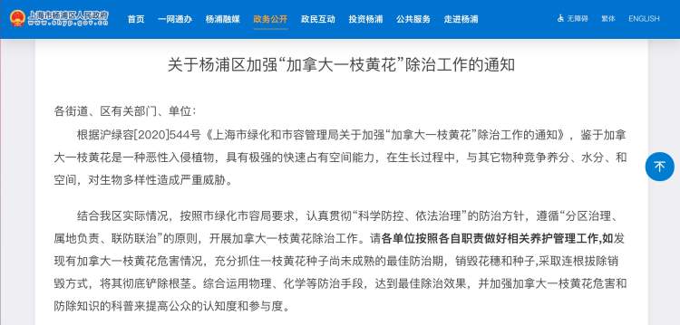 多年来,上海也一直在对加拿大一枝黄花严加防控,曾经开展过多次大规模清剿一枝黄花的行动。去年,市绿化部门还发布过除治加拿大一枝黄花的通知。