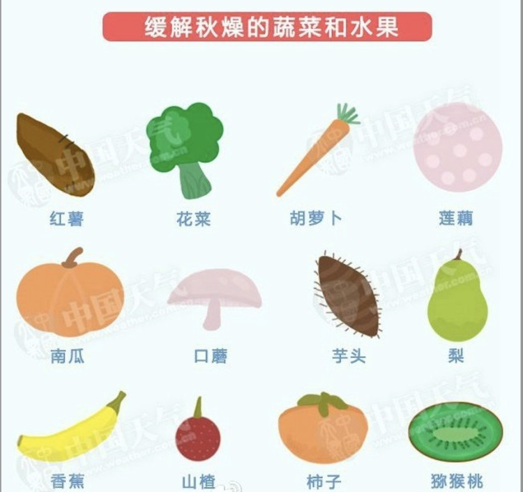 多喝水,多吃缓解秋燥的果蔬。