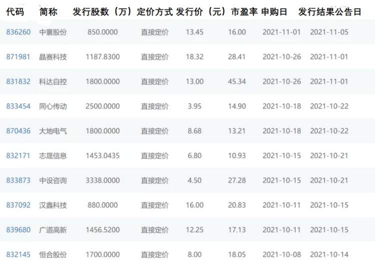 其中10家公司将直接在北交所上市,分别是大地电气、汉鑫科技、中设咨询、志晟信息、中寰股份、广道高新、同心传动、晶赛科技、科达自控和恒合股份;这10只新股均采用直接定价的发行方式,且均采用战略配售。71家存量精选层公司将平移至北交所上市。