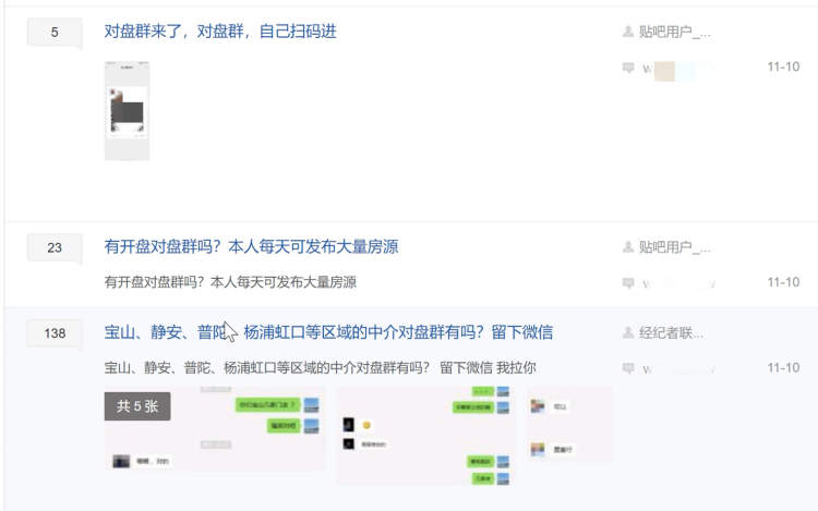 在百度“上海房产吧”内,有不少人发帖招募房产中介加入“对盘群”。在一则名为《徐汇对盘群,留号码,拉你进群合作共赢》的帖子下方,不少人留下了自己的微信号。