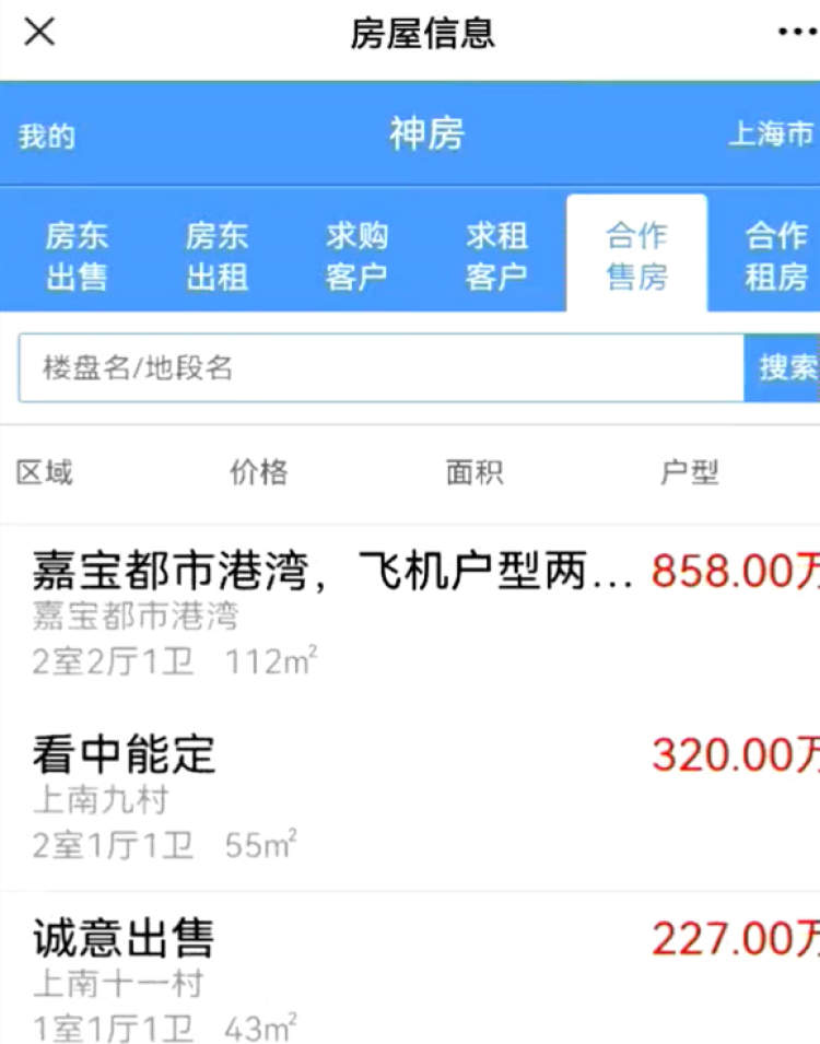 此外,使用者还可以自行录入房源。使用者主动录入的房源,会出现在“神房”小程序“合作售房”板块。