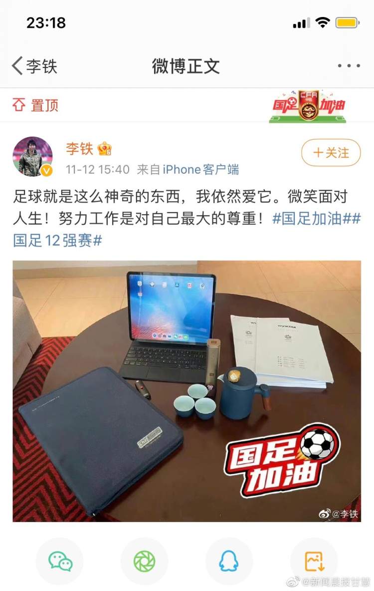 不仅是朋友圈,李铁还更新了自己的微博。北京时间11月12日下午,李铁在微博上晒出了自己的工作照片,并配文写道:足球就是这么神奇的东西,我依然爱它。微笑面对人生!努力工作是对自己最大的尊重!李铁特意将这条内容置顶。