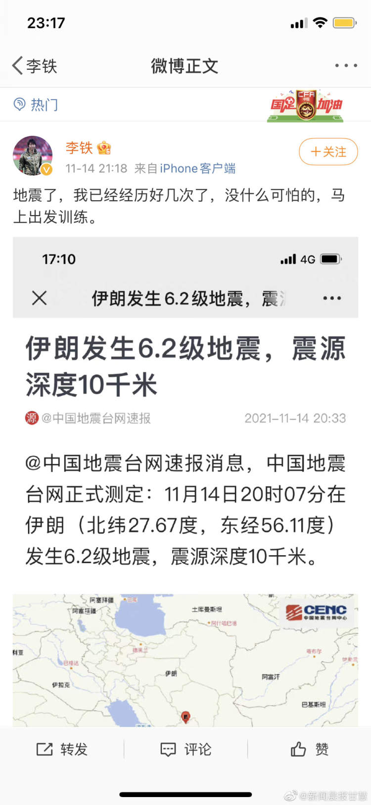北京时间昨天晚上,李铁再一次更新了自己的微博,“地震了,我已经经历好几次了,没什么可怕的,马上出发训练。”