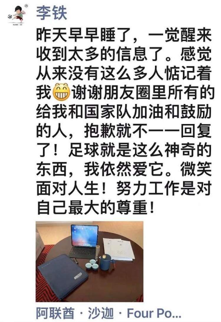 上轮与阿曼的比赛,李铁的换人被认为是比赛的转折点。正在在换人调整之后,原本领先的国足被对方扳平一球,最终无奈接受平局的结果。赛后,媒体、球迷对于李铁的批评、质疑铺天盖地。巨大的舆论压力下,李铁在朋友圈里发了这样一段话:昨天早早睡了,一觉醒来受到太多的信息了。感觉从来没有这么多人惦记着我(咧嘴笑)……