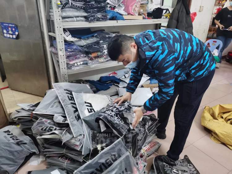 经调查,犯罪嫌疑人廖某于2009年起经营服饰生产和销售,由于自己的服饰品牌影响力不足,致销量惨淡。自2018年起,廖某伙同多名亲友聚焦“潮牌”服饰的仿制生产,并以低价吸引消费者牟利。其中,廖某等人作为生产源头,在未经品牌方授权的情况下仿制多个品牌的商标、配件,并进行批量生产;申某等人开设批发档口,根据下游代理订单进行打包批发,并在网购平台开设线上店铺进行“直营”。
