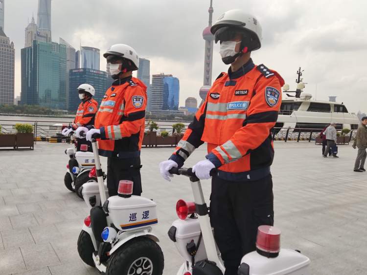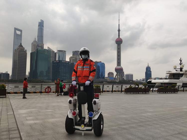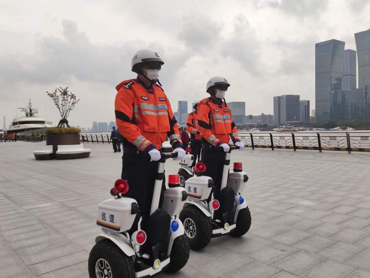 考虑到滨江区域过道狭窄、人员密集等特点,上海市公安局边防和港航公安分局在徒步巡逻和警车巡逻的基础上,叠加采用警用平衡车巡逻,并组建了专业巡逻组。