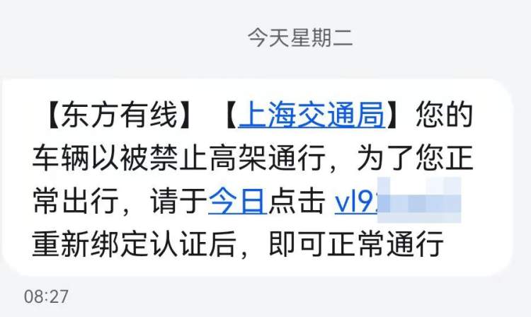 11月16日,市民刘某收到一条短信,“【东方有线】【上海交通局】您的车辆已被禁止高架通行,为了您正常出行,请于今日点击 vl**.cn/Y 重新绑定认证后,即可正常通行”。