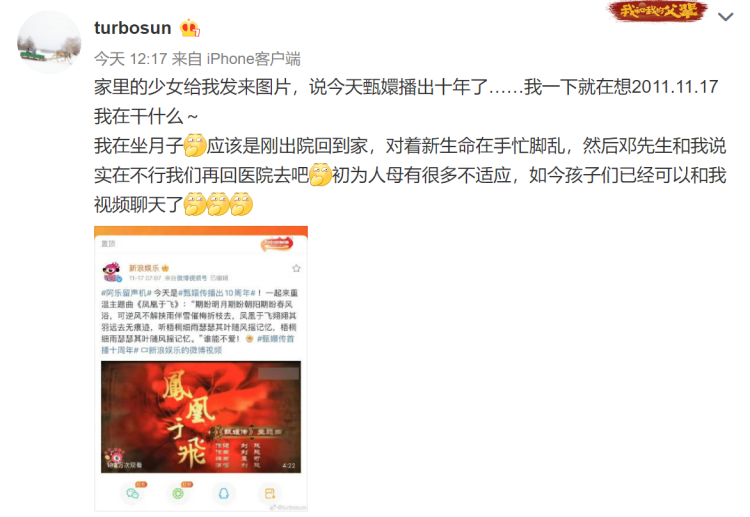 孙俪回想十年前的首播日,称自己当时还在坐月子,“对着新生命在手忙脚乱”。