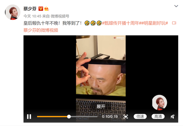 蔡少芬隔着屏幕弹陈建斌的脑门,“皇后报仇十年不晚!我等到了!”