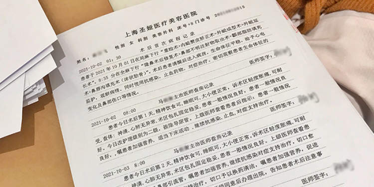 小蒋说,她不敢在湖南当地治疗,因为她的鼻子手术是在上海做的,万一在湖南的医院里出了什么事,她就没法去找圣娅医美。于是,10月11日下午4点,她购买高铁票,于当晚11点多到了上海,直接去了圣娅医美。