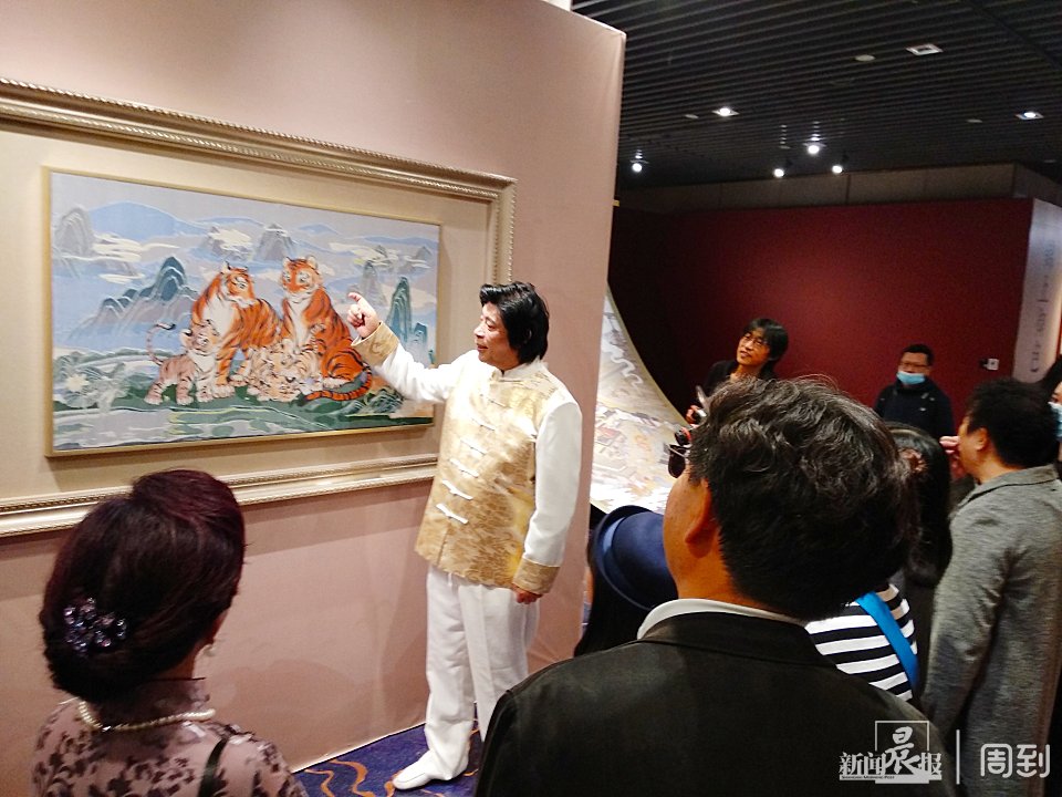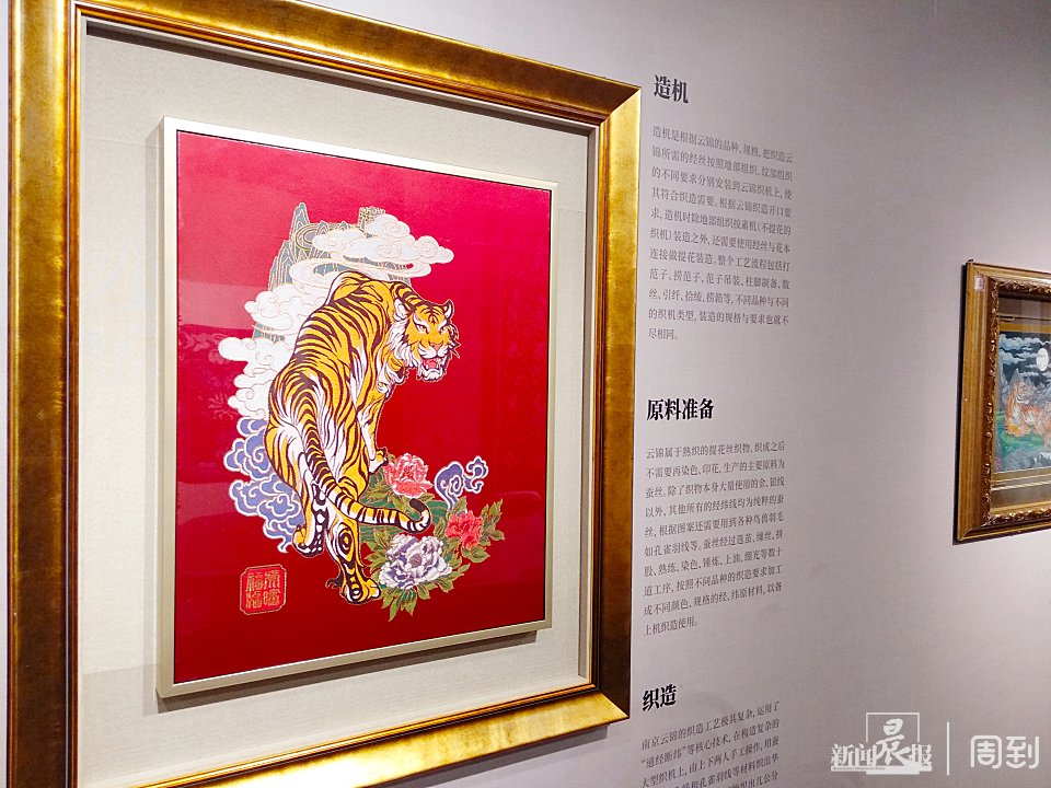 展览主要围绕“锦中瑞意”、“锦上御色”、“锦里知时”三个不同维度进行,展示南京云锦的经典纹饰和文化内涵,讲述当代云锦的艺术突破与时代活力。记者注意到,在展览的开始部分摆了一组虎的作品,金文向记者解释:这主要是因为明年就是虎年,以此祝福大家“虎虎生威,虎啸福临”。