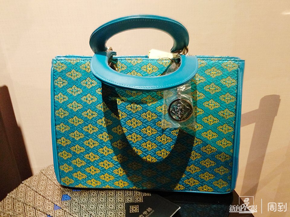 在展览现场,记者还看到了一款由金文设计,使用雄蚕丝材料制作的包包,据悉,这款样式的包包曾在2014年南京青奥会作为赠送给外国元首的礼物,价值不菲。