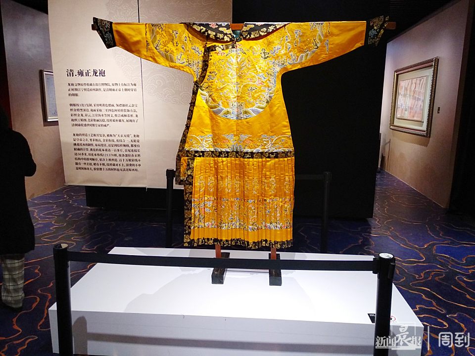 据介绍,龙袍文物原件收藏在故宫博物馆,原物上有标注为雍正时期江宁织造府所制作,是清朝雍正帝上朝时穿的朝服(也叫朝袍)。金文制作的朝服按1比1复制,采用明黄色缎面,领襟镶祥云杂宝织金缎黑滚边。袍面采取二至四色晕的装饰方法。彩织金龙、彩云、江崖、海水等图文,组合成柿蒂形。龙袍织工精细,色彩艳丽沉稳,纹样质朴雄浑,展现出了清朝康乾盛世皇家的威严。