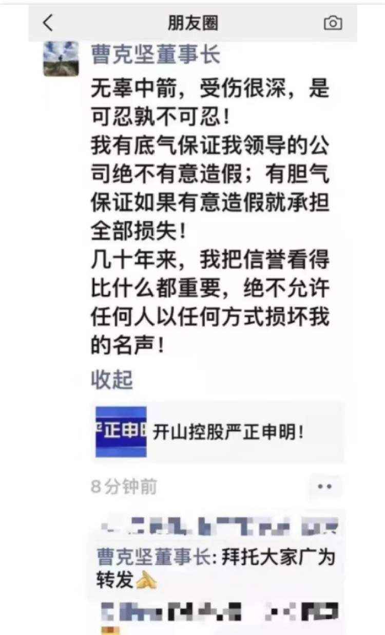 2020年曹克坚凭借95亿元的身家登上浙江衢州首富。22日,曹克坚的朋友圈截图也在业内流传,称“无辜中箭,受伤很深,是可忍孰不可忍”。