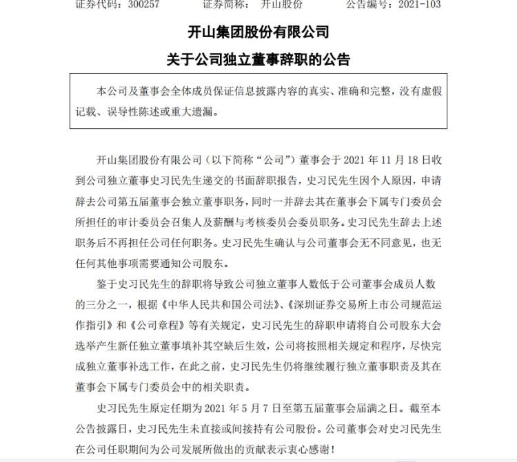 11月22日,开山控股在公开声明中表示:“本集团对史习民先生在担任‘开山股份’独立董事仅五个月时间,在极易误导投资者的情况下拒绝公司挽留要求,执意辞职的行为表示强烈不满,对他的职业操守给予谴责。”