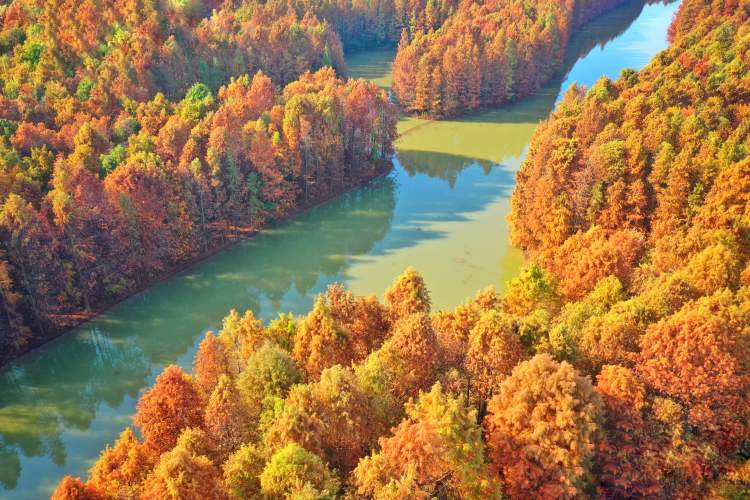 游客可以搭乘观光红船,也可以划一艘皮划艇,穿梭于水巷中,观赏到火红的树影倒映在湖面中;天空、红杉林与平静的湖面一起相互映衬,美不胜收。坐在船上,看远处的杉林,仙雾缭绕,晶莹剔透,别有一番风味。