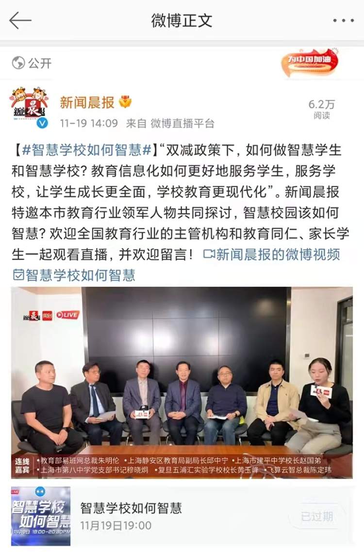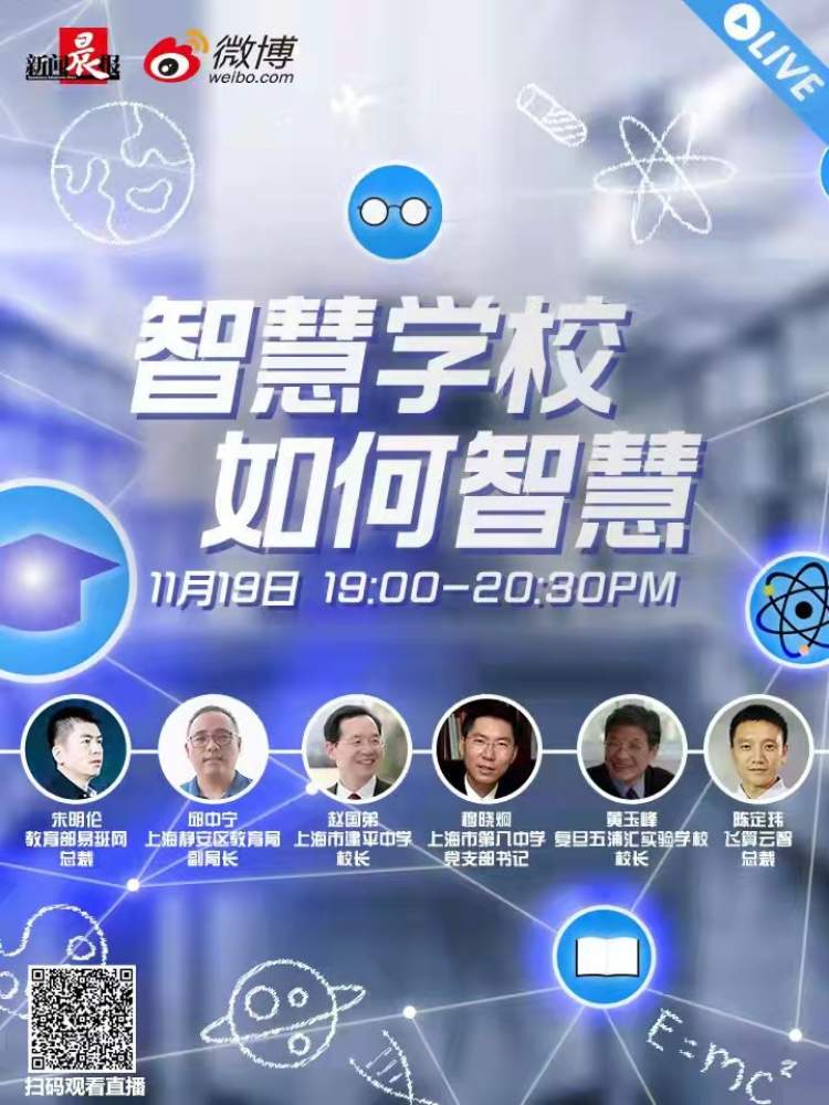 近日,新闻晨报特邀沪上知名校长——上海市建平中学校长赵国弟、上海市第八中学党支部书记穆晓炯、复旦五浦汇实验学校校长黄玉峰、教育部易班网总裁朱明伦、静安区教育局副局长邱中宁以及飞算云智总裁陈定玮,共同探讨互联网时代背景下,智慧学校如何体现,并通过新闻晨报官方微博账号进行了直播。