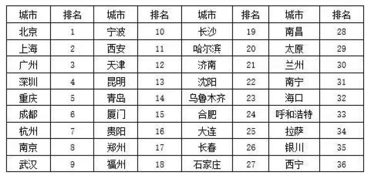 36个城市排名中,北京、上海、广州、深圳和重庆排名前五位。成都、杭州、南京、武汉和宁波进入城市休闲化指数评价排名第六至第十名,表明这些城市休闲化发展的和谐性、均衡性也比较显著,所以能够成为中国城市休闲化发展的领先城市。
