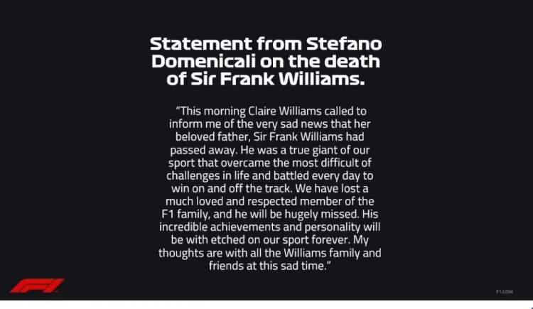 威廉姆斯爵士的逝世,在F1引发了无限的追思。国际汽联发文称:“我们对弗兰克·威廉姆斯爵士的离去感到最深切的悲痛,他的一生被赛车运动的热情所驱动,他留给世人的遗产是不可估量的,他将永远是F1的一部分。认识他是一种鼓舞和荣幸。他将被我们永远深深怀念。”