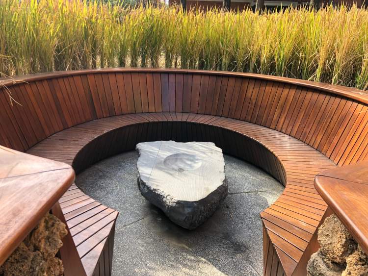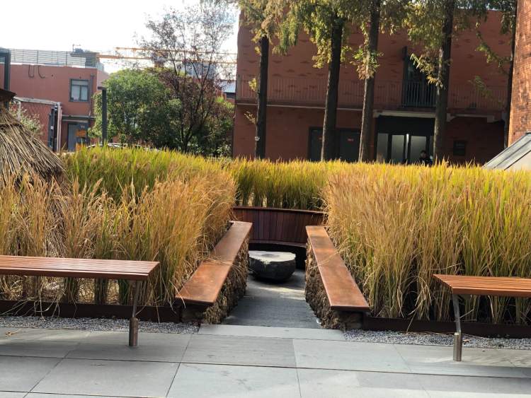 这块稻田地处上海最大的单体创意产业园区之一,步步有景,却各不相同。走到小径通幽深处,半开放式环形山木质座位,加之自然石器茶几,可供游客稍坐小憩或凹个造型。