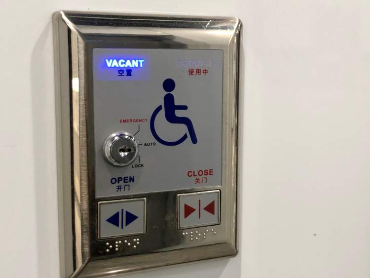 门口的电子显示屏上,清楚地呈现出厕位的使用状态:“空置”(Auto)或“使用中”(lock),乘客可根据状态进入厕间,直接避免了误入的尴尬。
