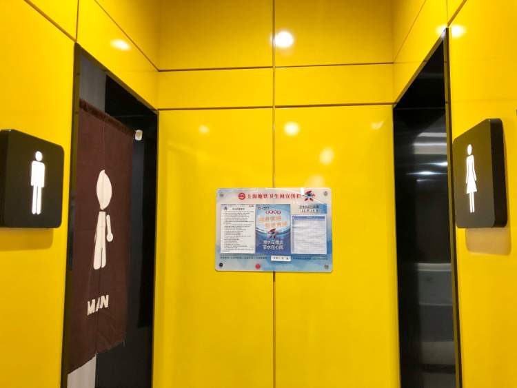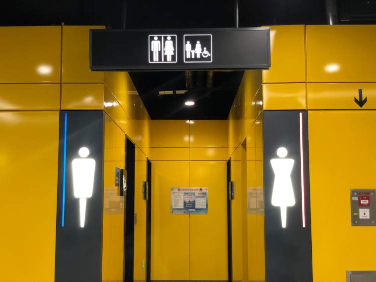 沿明黄色墙体向前看,从站台延伸至卫生间呈现整体温馨的效果,矩形的空间布局合理涵盖了传统男、女卫生间、第三卫生间(含母婴室)。