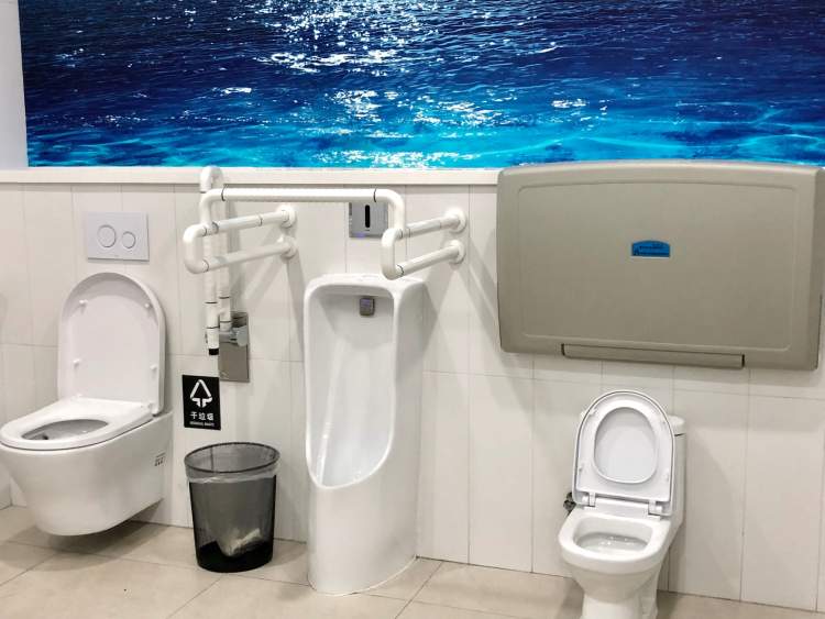 安装高度不同的洗手池,让成年人和儿童都能正常使用。同时,配备适老设备,坐便器、小便池附近设助力扶手,方便特殊人群使用。