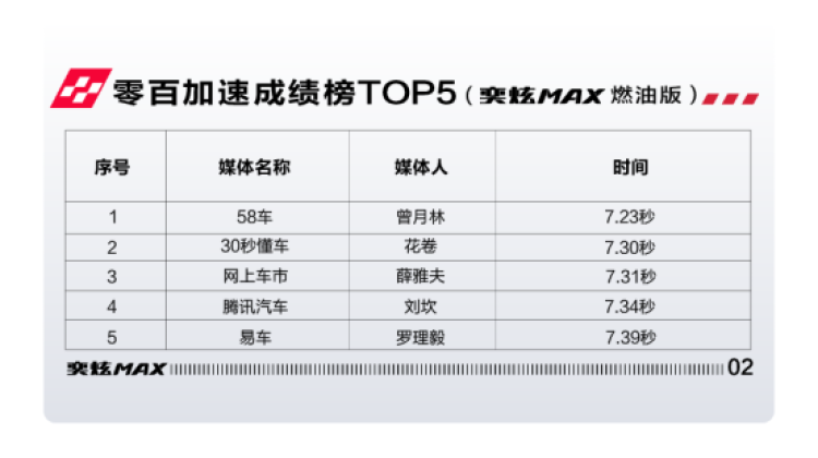 (专业媒体人驾驶奕炫MAX燃油版挑战零百加速top5成绩排行榜)