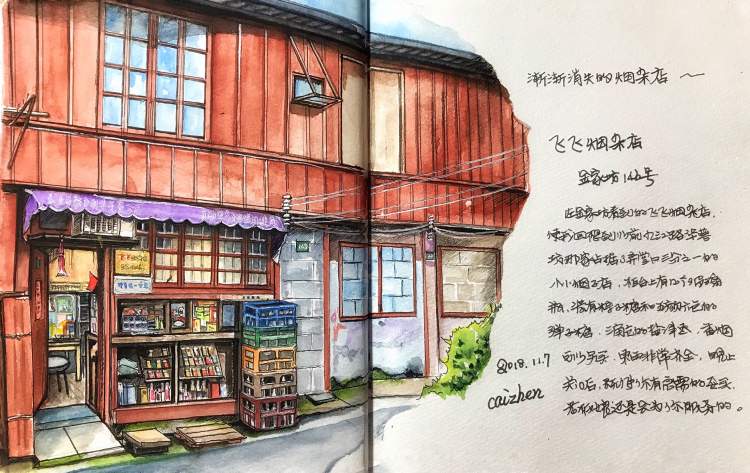 蔡震拍摄的照片与她画笔下的金家坊(下图为手绘作品)