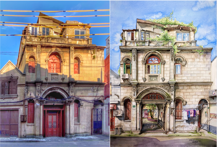蔡震拍摄的照片与她画笔下的梓园(图右为手绘作品)
