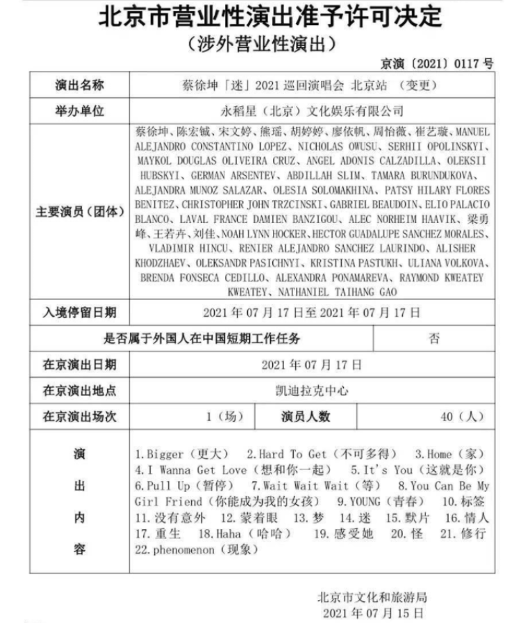 处罚决定书显示:艺人蔡徐坤的代理公司上海圣臻文化发展有限公司未取得《营业性演出许可证》,不具备演员经纪机构合法资质,利用其独占性艺人资源,在该艺人巡回演唱会北京站演出活动中,实际负责演出内容、演出票务、收入结算等营业性演出经营活动,并存在侵害公众正常购票观演权益的风险。对其未经许可擅自从事营业性演出经营活动的行为,北京市文化和旅游局于今年11月依法作出罚款的行政处罚。