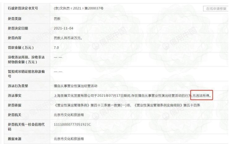 北京市文化和旅游局调查发现,圣臻文化并无违法所得,只是公司资质不全被罚了。