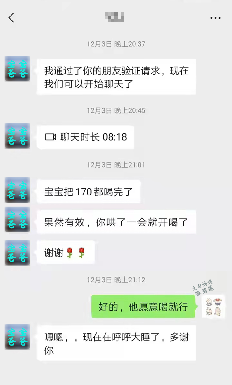 通过八分多钟的隔空安抚,宝宝情绪慢慢稳定下来,喝完170毫升的奶后呼呼大睡了。