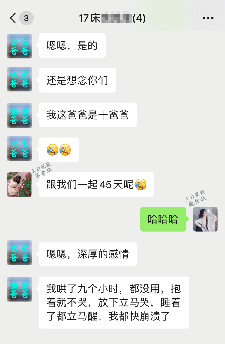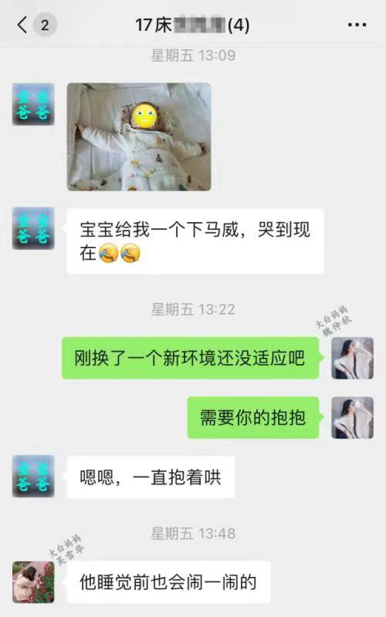 在为宝宝特地保留的住院患儿沟通群里,坚守在复旦大学附属儿科医院公卫儿科病房里的大白妈妈魏仲秋、张碧莲、吴雪华,相继接力支招。