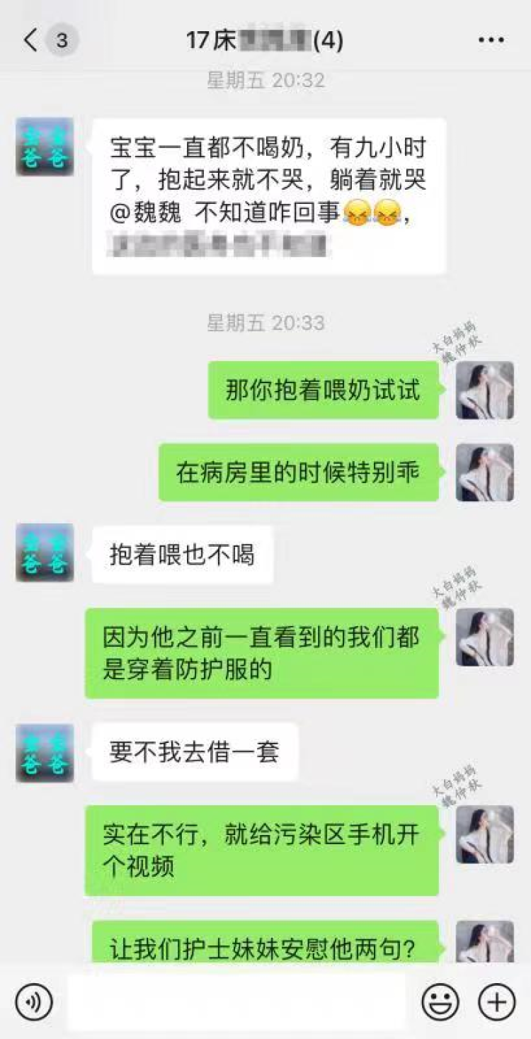 考虑到宝宝和穿防护服的医护人员相处时间较长,大白妈妈魏仲秋医生提议:“实在不行,就拨打隔离病房的手机微信,让护士来安抚宝宝。”
