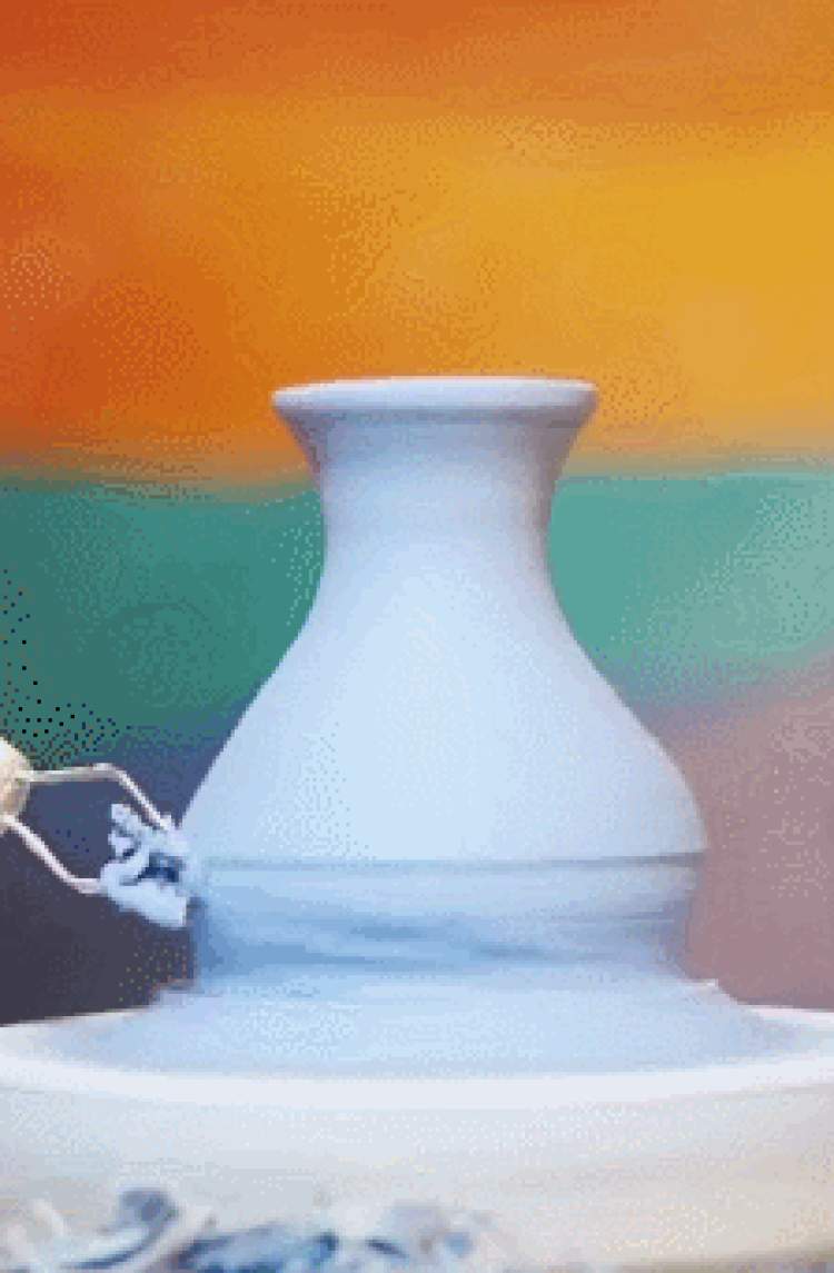 视频中,从拉胚、利胚到上色,王师傅仅用一块小小的泥巴,转瞬间就创作了各式各样的花瓶↓