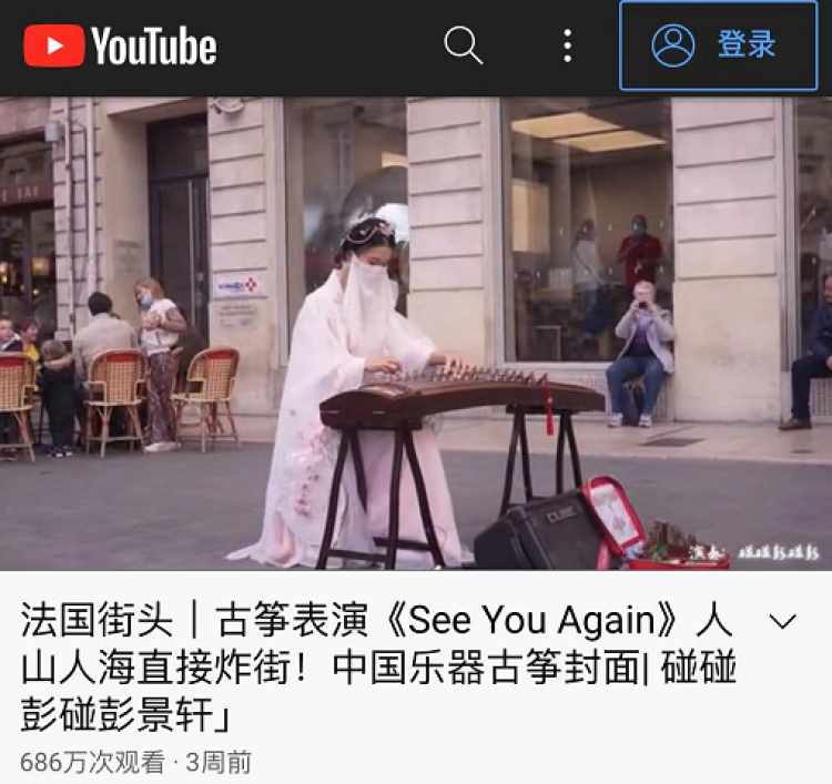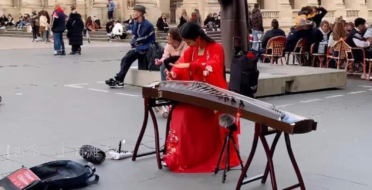 此前,微博上有个话题 #留学生国外街头弹古筝惊艳外国人# 。视频中的留学生小姐姐身穿古风服饰,在繁华的法国街头弹奏古筝。 ↓