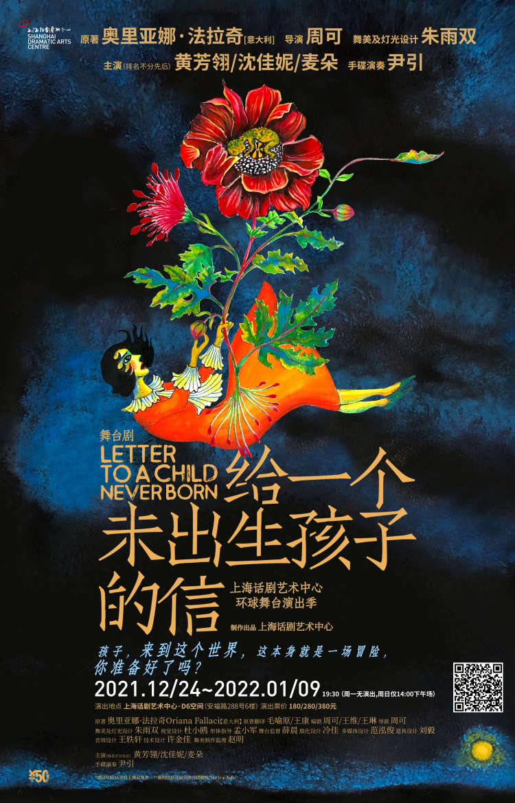 上海话剧艺术中心·环球舞台演出季剧目,改编自意大利著名记者、作家奥里亚娜·法拉奇同名小说,由导演周可执导的舞台剧《给一个未出生孩子的信》,朱雨双担当舞美及灯光设计,黄芳翎、沈佳妮、麦朵(排名不分先后)三位女演员联合主演。目前该剧正在创排阶段,将于2021年12月24日至2022年1月9日正式首演于上海话剧艺术中心·D6空间。