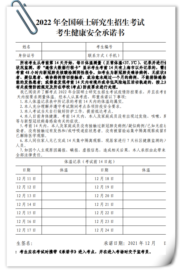 考生须在12月11日前通过微信小程序或支付宝完成本人“随申码”及“通信大数据行程卡”申请注册,同时在“上海招考热线”网站下载打印《2022年全国硕士研究生招生考试考生健康安全承诺书》,做好备考期间个人日常防护和健康监测,按要求如实、完整填写《承诺书》相关信息和健康数据并签字确认,并对《承诺书》真实性负法律责任。