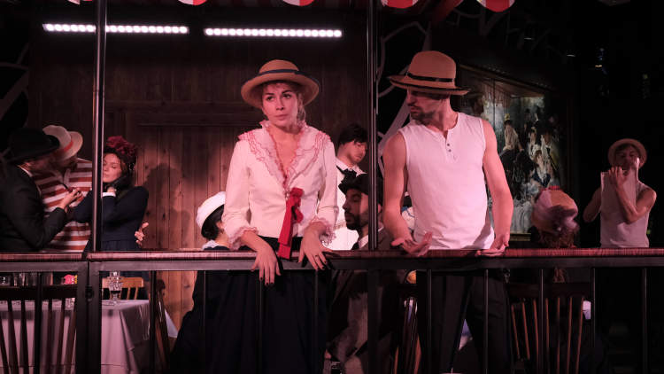 《游艇上的午餐》中,十余位演员在微波轻漾的塞纳河畔悠闲地享用午餐、热烈举杯,完美再现了19世纪末20世纪初巴黎明媚午后的人文生机,将雷诺阿笔下的甜美展现地淋漓尽致。《最后的晚餐》则更为肃穆,几组人物在不同场景中或窃窃私语、或彼此揣测,各怀心思,最终相继走上长桌,形成达芬奇笔下的经典构图……在灯光的明暗错落间,十三人的情绪与心事昭然若揭。