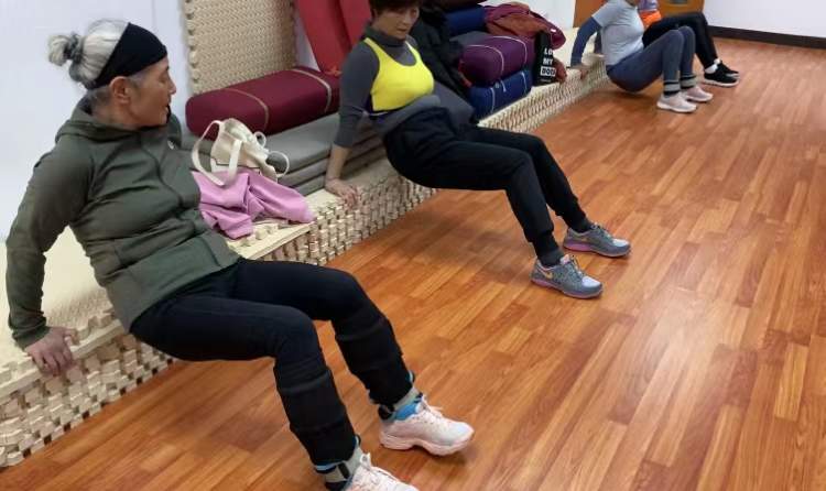 每周一的上午和下午各一节,陈奶奶都会到这里带领学员进行体育锻炼。热身、核心锻炼、拉伸运动……在周到君看来,一堂课下来的运动量属实不小。