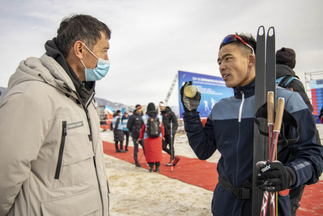 这是一次训练结束后,在温泉县越野滑雪,吐尔松江·布尔力克(右)和体育启蒙老师阿布都沙拉木·赛买提交流(2021年11月22日摄)。这次回乡训练比赛,吐尔松江吸引了家乡父老的目光。