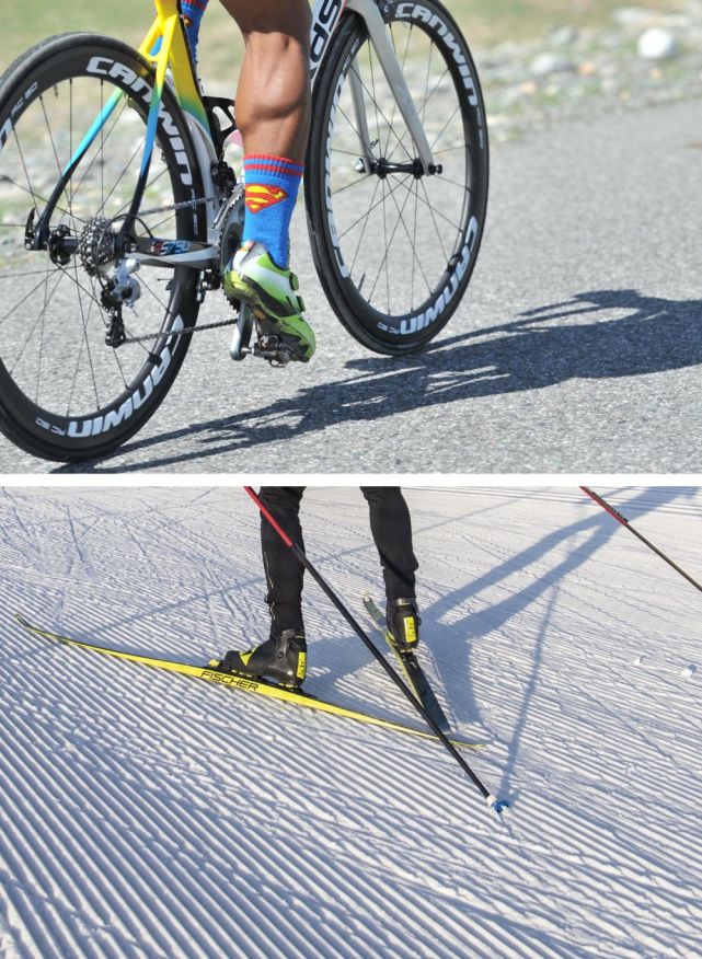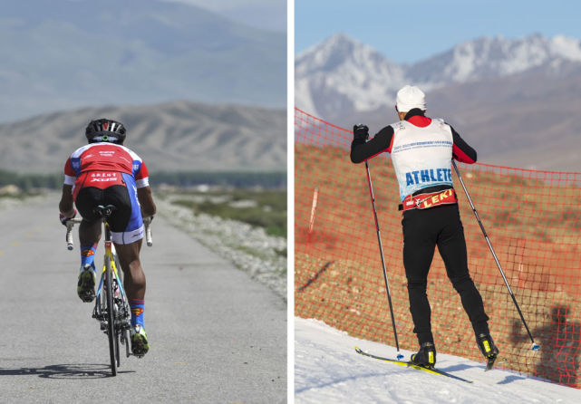 拼版照片:上图为第十一届环赛里木湖公路自行车赛前,吐尔松江·布尔力克在温泉县的一处乡村公路上练习(2017年5月29日摄);下图为吐尔松江·布尔力克 随越野滑雪国家集训队在新疆温泉县越野滑雪场训练(2021年11月25日摄)。
