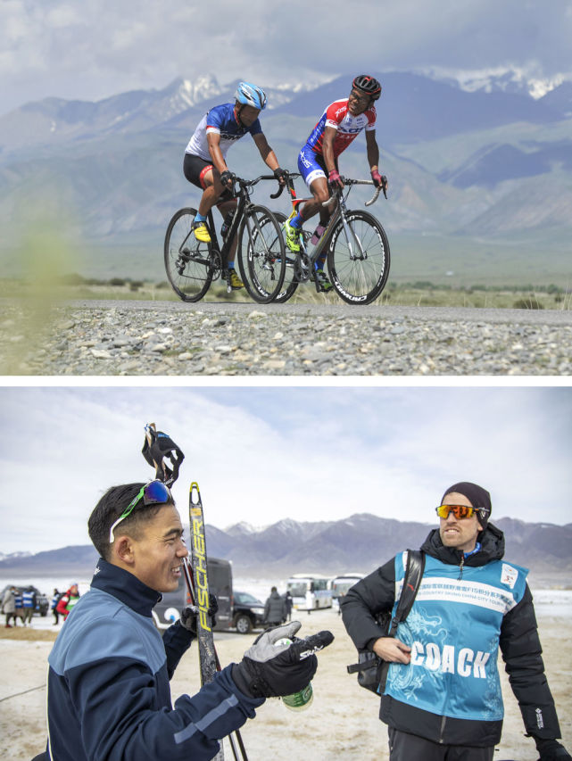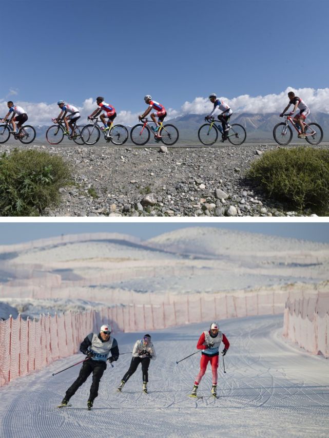 拼版照片:上图为第十一届环赛里木湖公路自行车赛前,吐尔松江·布尔力克(左三)和同伴在温泉县的一处乡村公路上练习(2017年5月29日摄);下图为吐尔松江·布尔力克(左)和越野滑雪国家集训队队友在新疆温泉县越野滑雪场训练(2021年11月21日摄)。
