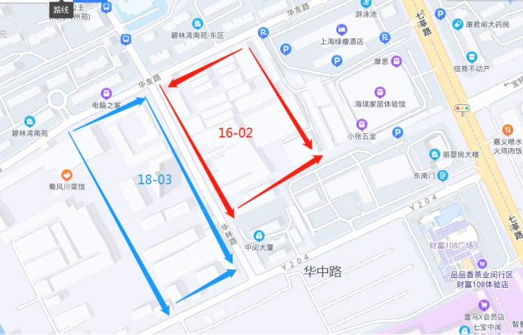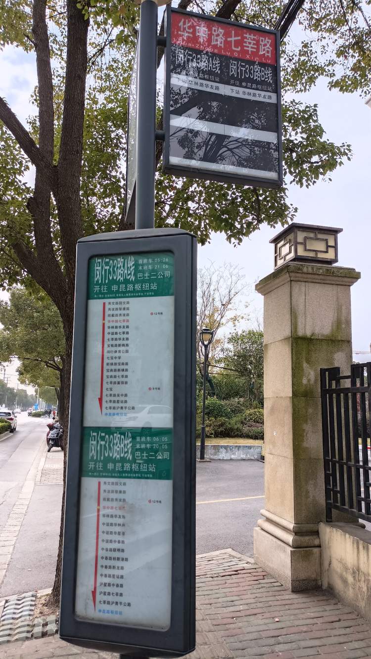 华中路上的闵行33路公交车站,乘坐闵行33路可以换乘地铁9、12号线。而步行前往12号线七莘路站,根据实测在10-15分钟内可到达,比较可以接受。