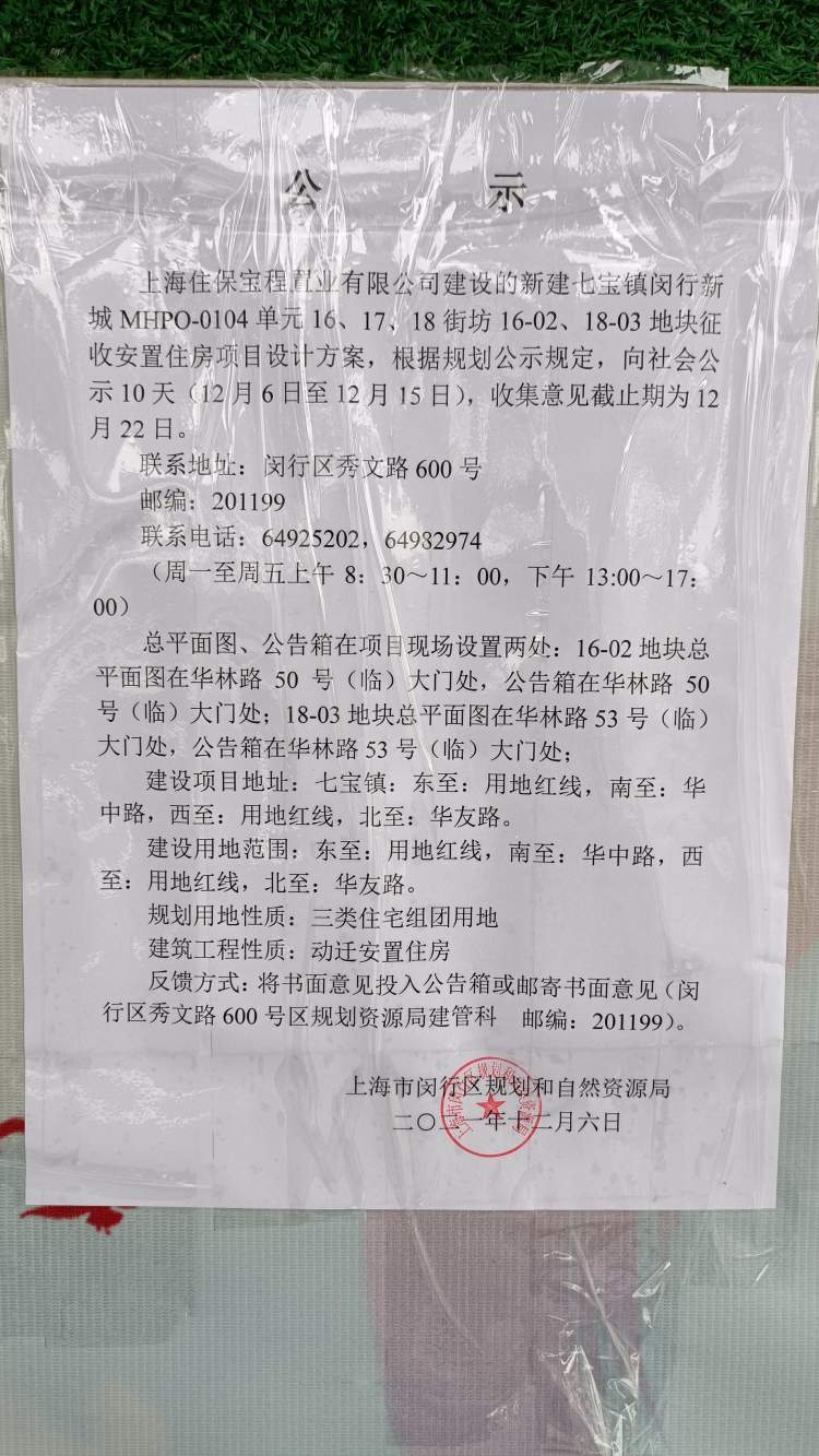上海住保宝程置业有限公司建设的新建七宝镇闵行新城MHPO-0104单元16、17、18街坊16-02、18-03地块征收安置住房项目设计方案,根据规划公示规定,向社会公示10天(12月6日至12月15日),收集意见截止期为12月22日。