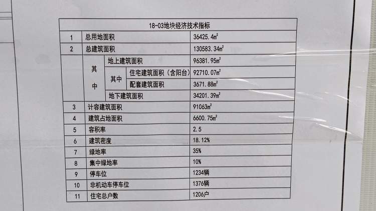 18-03地块共有9栋住宅楼,居民1206户,机动车停车位1234个。两个小区的容积率、绿化率、建筑密度等指标基本一致。